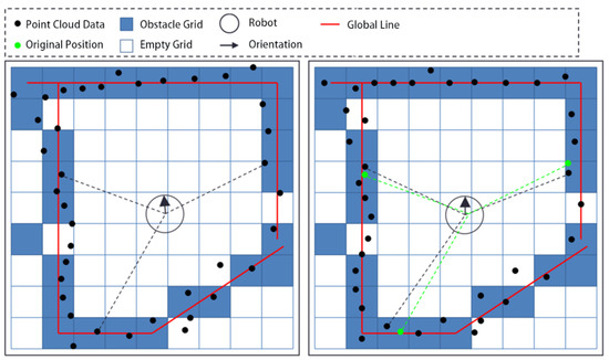 Figure 3 shows that the distance between the point cloud and line features is large before registration, and the distance becomes smaller after registration. As described in Section 3.2, the registration process involves rotating and translating the point cloud, and the same operations are applied to the robot’s pose.