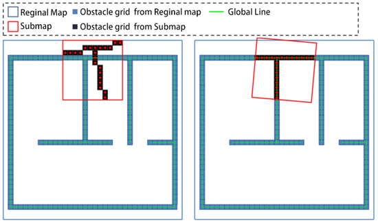 - Second registration: Align the updated submap and regional map by using the improved PLICP. Based on the registration results, the submap and robot pose are adjusted. The regional map is a grid map formed by fusing submaps within a region. These regions are obtained by dividing the workspace into relatively independent sections at a set distances. In the initial stage of the robot entering a region, the regional map has not yet been established, so the submap is directly used to update the regional map.