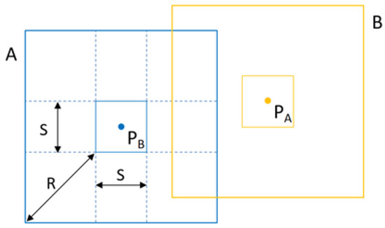 The overlap range between regional maps is shown in Figure 7. The orange and blue thin solid line frames represent the ranges of Region A and B, respectively; and are the center coordinates of Region A and B, respectively; S is the region width; and R is the maximum measurement distance of the LiDAR sensor. The overlap degree of Regional Map A and Regional Map B is shown in Equation (12).