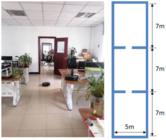 The test environment is shown in Figure 8; it can be seen that the test environment consists of three rooms, forming a rectangular space of 21 m × 5 m. The environment includes obstacles such as tables, chairs, and miscellaneous items.