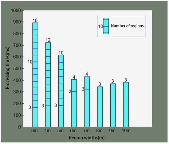The graph optimization processing time under different region widths is shown in Figure 9. In the figure, each column corresponds to a different region width, the blue lines within the column represent the number of regional maps, and the number at the top of each column is the final number of regional maps.