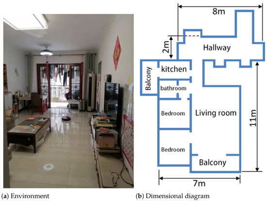 From Figure 10, it can be seen that the indoor environment is a residential setting, including a living room, bedrooms, balcony, kitchen, bathroom, and common hallways, with a total area of approximately 100 . To enhance realism, the experiment was conducted in a real-world environment with normal human activities.