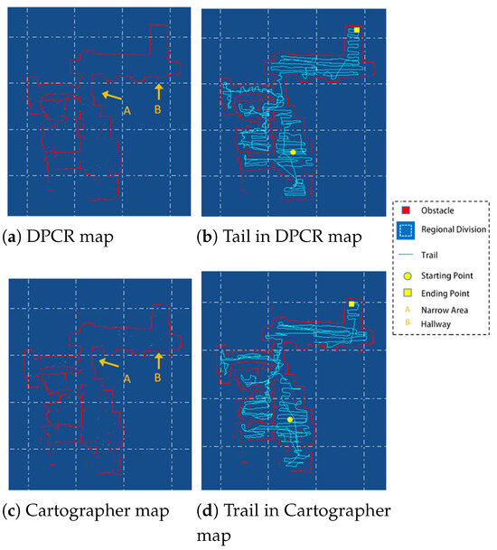 From Figure 11b,d, it can be seen that to complete the floor cleaning task, the cleaning robot needs to traverse all accessible areas, resulting in dense trajectories. Cartographer store submaps for back-end graph optimization and global map generation. In practical robot applications, however, overlapping movement paths create redundancy between submaps, which wastes storage resources. In contrast, the proposed method stores regional maps for graph optimization, significantly reducing the number of stored maps and improving the issue of excessive information redundancy between different maps.