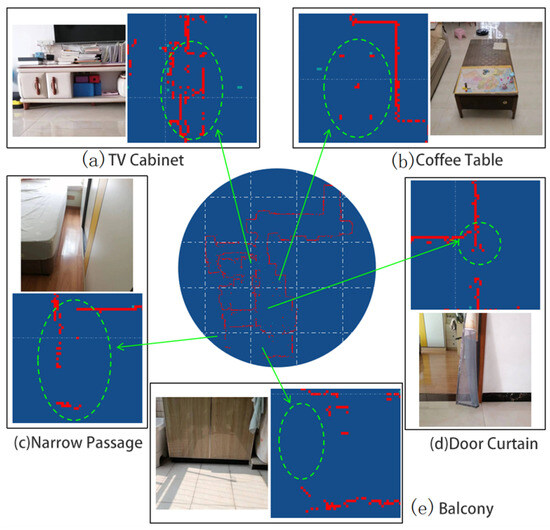 Figure 12a shows a TV cabinet with a certain height between its bottom and the floor. This height is approximately the same as the robot’s LiDAR sensor. The sensor has a certain probability of detecting the wall behind the TV cabinet, and also a certain probability of detecting the cabinet itself. Therefore, this local environment is represented in the map as parallel, interlaced, and mutually complementary line segments.