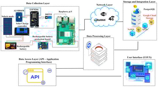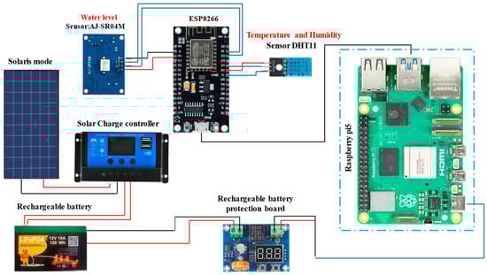 Figure 2 shows the data collection layer, designed to gather data and other environmental information necessary for monitoring and decision-making regarding water resources. It was implemented using industrial microcontrollers, renewable energy sources, and cloud technologies, enabling it to function effectively in remote or autonomous environments. The data collection layer includes the following components: (1) The solar panel converts solar radiation into electricity and supplies it to a battery to ensure uninterrupted power for the monitoring system. Due to the high solar activity in the region and the system’s low energy consumption, even a small solar panel is sufficient for this function; (2) A battery with a power converter is designed to accumulate and store electrical energy from the solar panel and supply power to all system components, including the microcontroller and sensors. A voltage stabilizer allows for the continuous operation of electronic devices for round-the-clock monitoring of water levels and environmental conditions; (3) The system includes a solar charge controller, which plays a crucial role in managing the power supply when using solar energy as the primary source. This component regulates the voltage and current coming from the solar panels to the battery, ensuring efficient charging while preventing overcharging, deep discharging, and power fluctuations. By maintaining battery health and stability, the solar charge controller contributes to the autonomous and sustainable operation of the system, particularly in remote areas where a reliable electrical grid may not be available. (4) Microcontroller ESP8266 (Espressif Systems, Shanghai, China) serves as the central control unit. According to the program stored in its memory, it processes data from connected sensors (temperature, humidity, and water level), establishes a wireless connection with cloud storage, and transmits the data. The ESP8266 board supports Wi-Fi connectivity with full TCP/IP stack capabilities based on a standalone microcontroller. This module allows microcontrollers to connect to Wi-Fi networks and establish simple TCP/IP connections using AT commands. The low cost and minimal number of external components on the module—and, consequently, the compactness and cost-efficiency of the system based on it—make this component the most suitable for our purposes; (5) Air temperature and humidity sensor DHT11 (ASAIR, Guangzhou, China) measures ambient air temperature and humidity. It monitors climatic conditions that may affect water evaporation rates and other environmental parameters. The data recorded by this sensor can be analyzed to generate predictive assessments of water resource conditions and support informed decision-making; (6) The water-level sensor, based on JSN-SR04T ultrasonic distance module, provides non-contact real-time measurements of the current water level in a reservoir. The module is housed in a durable waterproof casing and includes an integrated ultrasonic transceiver operating at an acoustic frequency of 40 kHz, along with a control circuit. It features low power consumption, with an operating voltage of 5V and current 30 of mA, and functions in the temperature range from −10 °C to +70 °C; (7) Raspberry Pi 5 serves as the processing unit for the system, while the Arduino IDE development environment is utilized for writing, debugging, and uploading the C++ code to the ESP8266 microcontroller. The Arduino IDE is a user-friendly and versatile platform that supports a wide range of development boards and libraries, making it well-suited for microcontroller programming in this application. Sensor data, including water level, temperature, humidity, and corresponding timestamps, is periodically collected and stored in a structured database. The Raspberry Pi 5 is equipped with its own local data storage, which allows for the temporary retention and processing of collected information. However, due to its limited storage capacity, a dedicated Storage and Integration Layer was incorporated into the system architecture. This layer is responsible for managing, aggregating, and processing data before transferring it to long-term storage or cloud-based services.