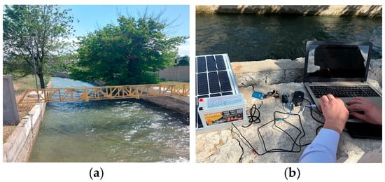 Test sites: (a) hydrological post of the left bypass canal; (b) field testing of the water level monitoring system model.