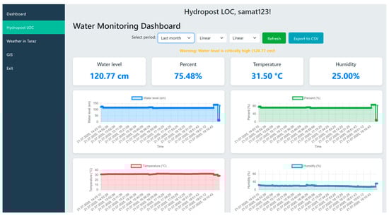 As shown in Figure 6, the data were collected hourly and stored in a database. These data can be used for analysis and decision-making in agriculture, water resource management, and the prevention of hydrological risks. For example, analyzing the dynamics of water levels makes it possible to identify patterns that indicate the risk of floods or droughts. Data on relative humidity and air temperature are useful for assessing evaporation and the water balance, which is important for forecasting dry periods. Most importantly, data on water percentage and level help plan irrigation cycles, avoiding water overuse or shortages.