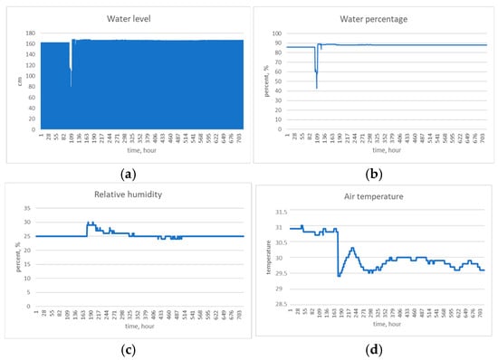 Monitoring results for 703 h: (a) water level; (b) water percentage; (c) relative humidity; (d) air temperature.