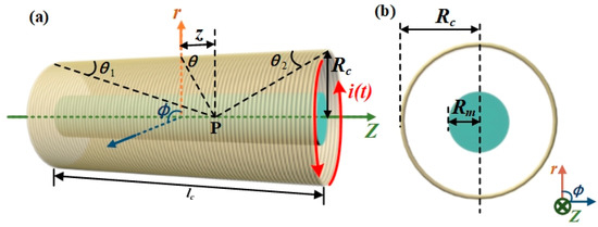 Suppose that the metal cylinder is located inside a long straight solenoid, and it carries a time-varying current i(t). Based on Equation (4), the average magnetic induction B(t) of the single-layer solenoid is regarded as a uniform axial magnetic field (by considering the edge effects) [29], whose magnitude can be expressed as: