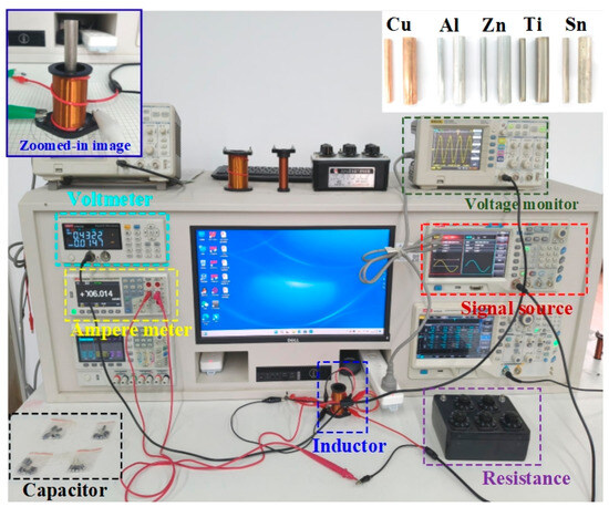 Figure 3 shows the photograph of the entire measurement system, which is composed of the electrical multi-functional testing system (including the signal sources, voltmeter, and ampere meter, purchased from Yulide Technology (Shenzhen, China) Co., Ltd., LAB—550 NeptuneLab, Dongguan, China), inductive coil (Andeli Electronics, Tianmen, China), capacitor (Kobe Semiconductor Co., Ltd., Shenzhen, China), oscilloscope (RIGOL technologies Inc., Suzhou, China, DS1052E).The inset displays the image of the testing metal with different radii, which includes the non-ferromagnetic metals, such as copper (Cu), aluminum (Al), zinc (Zn), titanium (Ti), and tin (Sn). The different metal cylinders were purchased from Huabei Technology Metal Materials, with high purity (>99.9%). The fabrication process involves pouring molten metal into a mold and then performing cylindrical cutting. To promote the testing accuracy of the electric conductivity, each type of metal cylinder has been prepared with different radii (2–10 mm) for measurement. The length of each type of metal cylinder is 10 mm, which is larger than that of the solenoid. According to Equations (5) and (20), the inductance of the solenoid can be calculated by offering the capacitance and the resonant frequency. In order to acquire the measured inductance with the highest accuracy, it is necessary to optimize the parametric factors. All the parameters utilized in the solenoid-based inductive sensor implemented with the RLC resonant circuit are summarized in Table 1. After the proper connection of the circuit, the experimental time takes several seconds to find the resonant frequency of each metal. Under the condition of keeping other parameters unchanged, the influence of the inductive sensor response characteristics with a specific element can be investigated. During the experiment, it is also worth noting that the solenoid coil and the metal cylinder should be placed at the position that coincides with the corresponding circle of a certain radius on the polar-coordinate paper to ensure that the center of the metal core is aligned with the center of the coil.
