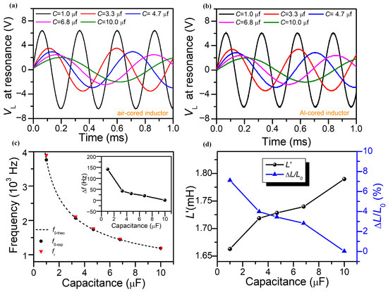 Figure 4a depicts the voltage across the air-cored single-layer solenoid, with the capacitances of 1.0 μF, 3.3 μF, 4.7 μF, 6.8 μF, and 10.0 μF in a series RLC circuit. The RC, N, and lc were set to 12 mm, 480 turns, and 60 mm, respectively. It can be seen that the amplitude of VL decreases with increasing capacitance. This result is attributed to the frequency reduction at the resonant state due to the rising capacitance, which leads to the quality factor (Q-factor) degrading as well. The Q-factor in series resonant mode (Qs) is defined as: . However, the amplitude of VL reduces when the single-layer solenoid is inserted by the Al core with a radius of 5 mm, as shown in Figure 4b. The different amplitudes of VL for the air-cored inductor were measured to be 6.4 V, 3.5 V, 2.9 V, 2.5 V, and 2.1 V, which correspond to capacitances of 1.0 μF, 3.3 μF, 4.7 μF, 6.8 μF, and 10.0 μF, respectively. Meanwhile, the amplitudes of VL for the Al-cored inductor were measured to be 5.9 V, 3.4 V, 2.8 V, 2.4 V, and 1.9 V, which correspond to capacitances of 1.0 μF, 3.3 μF, 4.7 μF, 6.8 μF, and 10.0 μF, respectively. Figure 4c depicts the resonant frequency of the RLC circuit in series mode with the various capacitances, where f0-exp and fr represent the measured frequency of the air-cored and Al-cored solenoid inductor. The dashed line represents the theoretical values of the resonant frequency (f0-theo) of the air-cored inductor versus the capacitance deduced by substituting Equation (5) into Equation (20), which suggests the f0-exp is consistent with the theoretical result. To better estimate the effect of VL with different capacitance, the inset portrays the frequency change (Δf = f0-exp − fr) by inserting the Al rod into the single-layer solenoid. Correspondingly, the calculated inductance of the Al-cored inductor (L′) versus the capacitance is portrayed in Figure 4d. The inductance of the Al-cored solenoid sensor can be obtained by providing the different resonant frequencies and capacitances. Since the sensitivity of the solenoid sensor is also affected by the pure coil inductance (L0), the normalized change rate of inductance () is defined as an effective parameter to estimate the properties of the inductive sensor. It can be seen that the normalized change rate of inductance decreases with rising capacitance. The above results illustrate that the lowest capacitance of 1 μF is beneficial to increase the sensitivity of the solenoid sensor.