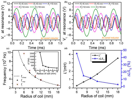 (a) Effect on voltages across the air-cored solenoid inductor with the coil radius of 6 mm, 8 mm, 10 mm, 12 mm, and 18 mm, respectively. (b) Voltages across the Al-cored solenoid inductor at the resonant state. (c) Resonant frequency of the RLC circuit in series mode with different coil radii. The inset shows the frequency change by inserting the Al rod into the single-layer solenoid. (d) Calculated inductance and relative change rate of the Al-cored solenoid sensor versus different coil radii.