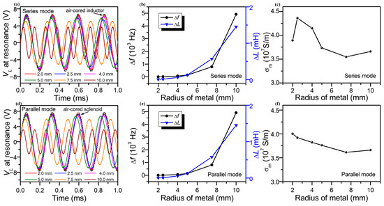 To confirm the effect of different testing modes, the inductive response characteristics of the Al-cored solenoid sensor were measured in both the series resonant mode and parallel resonant mode. Figure 6a draws the voltage across the solenoid inductor with the Al-cored radii of 2.0 mm, 2.5 mm, 4.0 mm, 5.0 mm, 7.5 mm, and 1.0 mm, respectively, which is tested in a series RLC circuit at the resonant state. The fill factor increases with the rising radius of the metal cylinder. The amplitude of VL decreases with the increasing radii and shows a lower value than that of the air-cored solenoid (which is depicted in the black dashed line). The amplitude of VL for the air-cored inductor in series mode was measured to be 6.7 V, while the VL for the Al-cored inductor was measured to be 6.5 V, 6.3 V, 6.1 V, 5.8 V, 5.1 V, and 3.6 V, which correspond to metal radii of 2.0 mm, 2.5 mm, 4.0 mm, 5.0 mm, 7.5 mm, and 10 mm, respectively. Moreover, the increment of the frequency and the inductance shows the rising trend with the metal radius as well, as proved in Figure 6b. Based on Equations (16) and (23), the experimental conductivities of different Al cylinders were calculated, as given in Figure 6c. The testing conductivity of Al measured by the series RLC circuit was estimated to be 3.89 × 107 S/m, 4.37 × 107 S/m, 4.14 × 107 S/m, 3.72 × 107 S/m, 3.55 × 107 S/m, and 3.65 × 107 S/m, corresponding to radii of the metal of 2.0 mm, 2.5 mm, 4.0 mm, 5.0 mm, 7.5 mm, and 1.0 mm, respectively. Analogously, the voltage across the Al-cored solenoid inductor shows a similar tendency with the various core radii in parallel mode at the resonant state, as given in Figure 6d. The amplitude of VL for the air-cored inductor in parallel mode was measured to be 7.6 V, while the VL for the Al-cored inductor with a metal radius of 2.0 mm was measured to be 6.5 V. The inductance changes can also be obtained from the resonance frequency of the parallel RLC mode, as shown in Figure 6e. Due to the effect of the eddy current in non-ferromagnetic metal, the inductance changes were 1.7 × 10−3 mH, 7.2 × 10−3 mH, 4.9 × 10−2 mH, 0.13 mH, 0.57 mH, and 1.45 mH, which correspond to metal radii of 2.0 mm, 2.5 mm, 4.0 mm, 5.0 mm, 7.5 mm, and 1.0 mm, respectively. As shown in Figure 6f, the result determines that the conductivity of the Al shows a falling tendency from 4.01 × 107 S/m to 3.65 × 107 with the increasing metal radii. It is apparent that the relation between the inductance and conductivity evaluated by the resonance frequency shows an analogous response for both series RLC circuits and parallel RLC circuits.