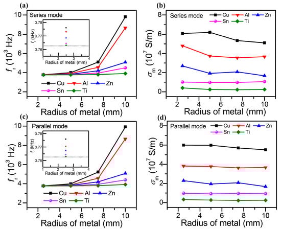 To further analyze the inductive sensor performance, Figure 7a depicts the resonant frequency of the RLC circuit versus the metal radii of different metal-cored inductors in series mode. The result shows that the non-ferromagnetic metals (such as Cu, Al, Zn, Sn, and Ti) exhibit a positive influence on the fr. Since the inductance of the single-layer solenoid is inversely proportional to the square of the resonance frequency, the inductance increment of non-ferromagnetic metal can change into different degrees of negative increment, which originates from various eddy current losses due to the conductivity of different metals. This phenomenon is consistent with our theoretical analysis. To express more details of the fr, the inset gives the zoomed-in frequency at the resonant state with the metal radius of 2.5 mm, which satisfies the above-mentioned variation trend. The conductivities of the various metals with different radii extracted from the parameters in the series circuit are determined based on Equation (16), as given in Figure 7b. It turns out that the conductivity exhibits different values with respect to the metal radius measured in the series RLC mode. The resonant frequency of the RLC circuit versus the metal radii of different metal-cored inductors in parallel mode is represented in Figure 7c. The fr of the non-ferromagnetic metal enhances with the increasing Rm as well. However, the calculated σm measured by parallel mode possesses better stability than that of the series mode, as illustrated in Figure 7d. This result can be ascribed to the variant resonant response of different modes. The Q-factor in parallel resonant mode (Qp) is defined as: , where iL0 is the amplitude of the current in the inductor. The condition for making Qp greater than Qs is defined by: . RS can always be treated as zero for an ideal inductor; however, this resistance exists in the experiment. The resistance of the proposed solenoid coil (~2.7 Ω, measured by digital multimeter which is included in the multi-functional testing system) is lower than the RL of 10 Ω, which leads to a higher Q-factor in parallel mode than that in series mode. This result makes the acquisition of resonant frequency more precise in parallel mode, which further enhances the accuracy and stability for conductivity measurement.