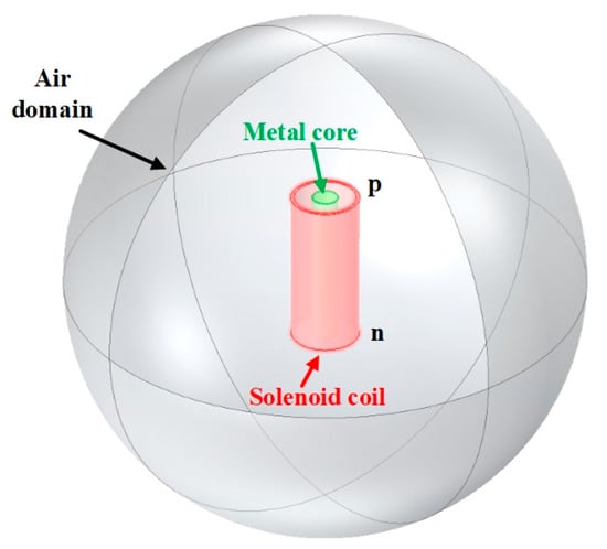 Compared with the analytical method, Figure 8 portrays the three-dimensional (3D) simulation model of the solenoid sensor supplemented to the RLC equivalent circuit representation by employing Comsol Multiphysics, which is implemented using the finite-element method (FEM). The material of the coil is copper, which is wrapped in the spherical air with the same parameter settings as in Section 2.1. The virtual equivalent circuit is constructed by the AC/DC module from point “p” to “n”, with the coil being connected in both the series mode and parallel mode. The simulation result for the inductive sensor is excited by the same condition as in Section 2.3, and the voltage output of the single-layer solenoid is expressed by the “external U versus I” module, which can obtain the inductive behavior and the field distribution in the media. It is worth noting that all the media are only described by the linear electromagnetic field model, which is proper for non-ferromagnetic metal.
