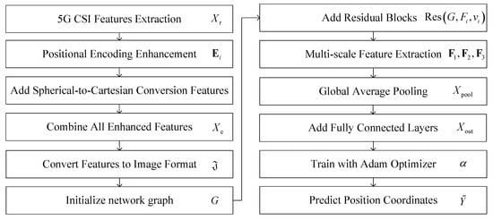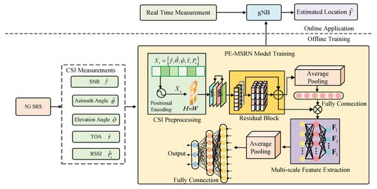 While deep learning has shown promise, a significant research gap remains [17,18,19,20,21]. Many existing models struggle to fully represent the complex spatial characteristics embedded in 5G CSI data. Specifically, they often lack: (1) a mechanism to explicitly encode directional and positional information into the input features, leading to the loss of crucial spatial cues; and (2) a network architecture capable of simultaneously capturing features at multiple scales and depths without suffering from gradient degradation. This limits their accuracy and robustness in challenging real-world environments. To bridge this gap, we propose PE-MSRN, a 5G positioning algorithm based on positional encoding and an image-based deep residual network. Our main contributions are as follows: