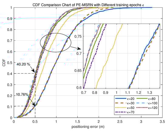 In terms of positioning accuracy distribution, the proportion of sub-meter predictions increases substantially from 50.96% at 20 epochs to 88.07% at 100 epochs, an improvement of 37.11%. Likewise, the proportion of predictions within 0.5 m rises from 10.76% to 40.20%, indicating an enhancement of 29.44%. These results demonstrate that with more training, the algorithm becomes increasingly capable of delivering high-precision location estimates with greater stability. When extended to 120 epochs, the mean error slightly increases to 0.6307 m, suggesting a potential onset of overfitting. Therefore, under the current experimental setting, 100 training epochs represent the optimal configuration for the PE-MSRN algorithm, balancing low positioning error with the highest proportion of sub-meter accuracy.