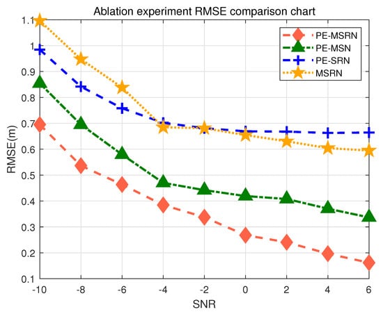 The PE-MSN algorithm, with the removal of the residual connection block, shows a 52% decrease in RMSE compared with the complete algorithm, with a practical measurement error of 0.32 m, confirming the critical role of residual blocks in alleviating gradient degradation during training and enhancing the performance of deep networks. The residual connection network enables the network to access features from earlier layers even in deep layers, strengthening the ability of the algorithm to express multi-scale and multi-level features. In 5G localization, spatial information (such as AOA) and temporal information (such as TOA) need multi-level fusion. The residual connection ensures that these features are not lost as the network deepens. The PE-SRN algorithm, with the removal of multi-scale feature extraction, shows a 75% decrease in accuracy, with RMSE approaching 0.6 m as SNR increases, resulting in overall higher errors. The multi-scale branches, compared with a single convolution kernel, allow the algorithm to learn both local and global features by combining convolutions with different receptive fields.