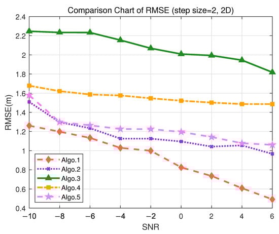 To evaluate the positioning performance of different algorithms in 2D localization scenarios, we conducted simulation experiments under two representative use cases: indoor trajectory tracking (requiring accuracy < 50 cm) and tool tracking (requiring accuracy < 2 m). In autonomous driving, it is essential to measure the 2D trajectory indoors, where high accuracy is crucial for positioning. Given the different tolerance levels for localization error in these scenarios, a 2D grid environment is designed using granularity of 2 m and 10 m, respectively. The use of root mean square error (RMSE) to calculate positioning errors can comprehensively reflect the average error level across multiple simulations, providing an intuitive representation of positioning accuracy. As shown in Figure 7, the performance of various algorithms under different SNR conditions is illustrated for the granularity of 2 m.