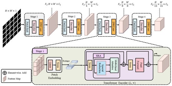 The Pyramid Vision Transformer (PVT) [39] introduces a pyramid that gradually shrinks and an attention layer that reduces the spatial dimensions to obtain high-resolution and multi-scale feature maps while minimizing the consumption of memory and computing resources. Based on the PVT, we develop a new encoder architecture, which can be seen in Figure 2.