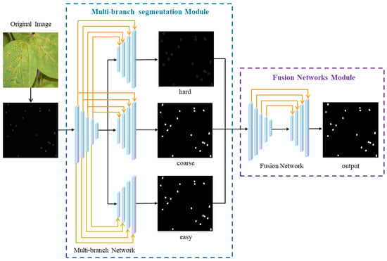 The multi-branch segmentation network automatically distinguishes the hard- and easy-to-segment regions of images of Phakopsora pachyrhizi and feeds them into the multi-branch segmentation network for training. Segmentation images from the respective network branches are obtained and used as input for the fusion network, along with the coarse segmentation images. Due to the structural similarity between the hard and easy segmentation regions, there is an overlap between these two coarse segmentation images. Therefore, a fusion network is employed to merge these two images with coarse-grained segmentation. The coarsely segmented images generated by the multi-branch segmentation network are used to train the fusion network, which is then given the original ground-truth values from the Phakopsora pachyrhizi dataset. This process is iteratively performed. The image is binarized and subsequently processed to produce the final segmentation result of Phakopsora pachyrhizi using the fusion result. This technique has the potential to effectively remove the overlap between the segmented images of these two distinct regions, thereby enhancing the overall segmentation accuracy.