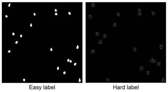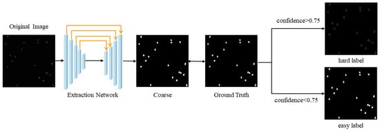 Our proposed decoder network aims to automatically acquire hard-to-segment regions and compel the network to learn. Therefore, we design a network architecture that automatically extracts hard-to-segment and easy-to-distinguish labels, as illustrated in Figure 4. First, the input information on the images is acquired through the designed hierarchical ViT encoder structure, and rough segmentation results are obtained. Next, the rough segmentation result is compared with the ground truth, and pixels with a confidence greater than 0.75 are considered well-segmented areas, while pixels with a confidence of less than 0.75 are considered poorly segmented areas. We set two masks both with 1 s, and , and dimensions of . The formula for generating the label is as follows: