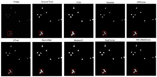 To demonstrate the details of the segmentation results better, an image of soybean rust fungus was used as the experimental subject. Experiments were conducted with traditional network structures like DeepLab and an FCN and advanced network structures such as UTNet, HRFormer, MobileVIT, Swin-UNet, and SegFormer. The experimental results are shown in Figure 6. As illustrated in Figure 6, in the soybean rust fungus (Phakopsora pachyrhizi) segmentation task, we observed significant differences in the performance of different algorithms. Figure 6 and Figure 7 (where Figure 7 shows the local magnification details) clearly demonstrate that the FCN, MobileVIT, and Swin-UNet exhibited overlapping phenomena when processing adjacent spores, leading to inaccurate segmentation results; while DeepLab, UTNet, HRFormer, and SegFormer avoided overlapping issues, they still had deficiencies in spore boundary localization and shape preservation, being prone to boundary blurring or shape distortion; our MS-UNet not only successfully avoided overlapping issues but also performed optimally in maintaining the complete spore morphology and boundary clarity.