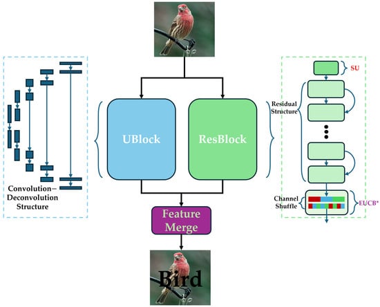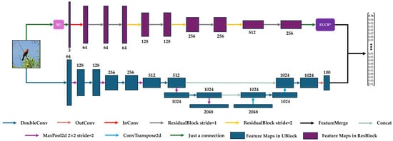 Our U-ResNet consists of three components: ResBlock (based on ResNet’s residual architecture), UBlock (based on U-Net’s convolutional-deconvolutional framework), and Feature Merge (a component to integrate the features from the above two blocks). In the ResBlock, we leverage the residual connection architecture from ResNet to mitigate the vanishing gradient problem. A Selected Upsampling (SU) module is embedded at the input stage of the ResBlock to upsample low-resolution images, smooth blurred edge features, and facilitate more effective feature extraction for subsequent convolutional layers. An improved Efficient Upsampling Convolutional Block [40] module (EUCB*) is integrated before the end of the ResBlock. The EUCB* enables U-ResNet to achieve faster convergence in classification tasks on high-resolution datasets and thereby greatly improves the learning efficiency. In the UBlock, we adopt the convolutional–deconvolutional structure from U-Net to enable precise pixel-level feature extraction, which is essential for tasks requiring dense prediction (e.g., image segmentation). The UBlock is integrated parallel to the ResBlock, allowing input images to pass through both blocks separately. The final Feature Merge combines the outputs of the ResBlock and UBlock along the channel dimension and makes the final decision for U-ResNet. In this way, our proposed U-ResNet achieves learning capabilities of image classification and segmentation while effectively alleviating difficulties in convergence speed for CNN-based deep learning networks.