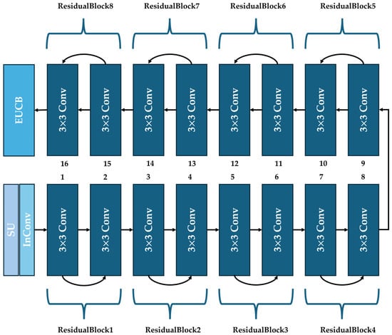In ResBlock, the stride of each ResidualBlock is kept as 1 to keep the size of the feature map constant when the map flows through the network. In order to reduce the amount of calculation for subsequent ResidualBlocks and to accelerate the speed of model inferences, other parameters are kept consistent with those for image classification. After 8 ResidualBlocks, the feature maps are upsampled back to the size of the original image via EUCB*.