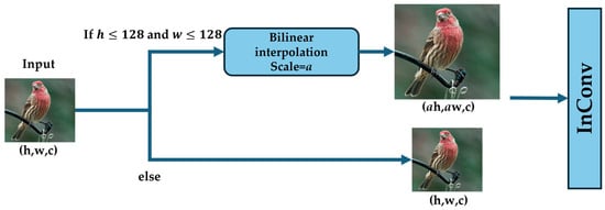 To improve feature extraction from low-resolution images (where limited pixels usually constrain the availability of image features) for the proposed U-ResNet structure, we added an SU module (Figure 3) at the input stage of the ResBlock. This module enlarged image size (with length and width pixels) via the bilinear interpolation method with an integer scaling factor of . The SU module also smoothed input images by refining coarse textures and features to enhance the image clarity for better recognition. Therefore, the SU module is a preprocessing operation to enable better identification and feature extraction for the subsequent ResidualBlocks structure and can improve the overall performance of our U-ResNet on low-resolution images. The effectiveness of SU was confirmed through ablation study (Section 3.8.1).