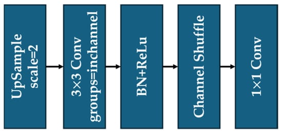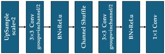 In EUCB*, we halve the group number inside the convolutional layer and add another convolutional layer with halved groups after the Channel Shuffle operation. This design enables cross-group pixel-level feature interaction across different channel groups within a single EUCB*. As a result, the proposed U-ResNet is equipped with a stronger feature extraction capability in cross-paradigm tasks of image processing. The detailed structure diagrams of the original EUCB and EUCB* are shown in Figure 4 and Figure 5, respectively.