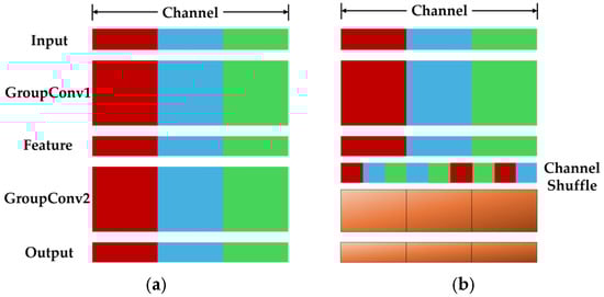 Channel Shuffle, first proposed in ShuffleNet [30], aims to overcome the side effects caused by group convolution and realize the flow of image information between different groups of channels. Operation without and with Channel Shuffle are compared in Figure 6. From input to output, the same color indicates channels in the same group. In Figure 6b, the network after Channel Shuffle produces more feature extraction paths, which helps the network encode more feature information through parallel processing and therefore significantly improve accuracy.