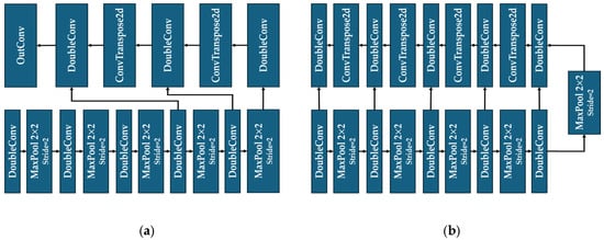 For image classification, since the feature maps are usually required to be flattened to vectors via fully connected layers, we streamline the UBlock in U-ResNet by reducing its deconvolution and DoubleConv modules. This operation minimizes the spatial size of the output feature maps from UBlock, decreases the number of parameters in the fully connected layer, and accelerates the overall computational efficiencies. Modifying the dimension of the feature maps also ensures that outputs from UBlock align with outputs from ResBlock, guaranteeing subsequent feature fusion operations. For image segmentation, in contrast, the UBlock retains its complete U-shape symmetrical architecture. In this task, the UBlock first follows a pathway of gradual downsampling, convolution, and cross-layer connections, then progressively restores the original image size via deconvolution, thus maintaining its classical U shape framework for pixel-level segmentation accuracy. Details of the UBlock are shown in Figure 7a for image classification and Figure 7b for image segmentation.