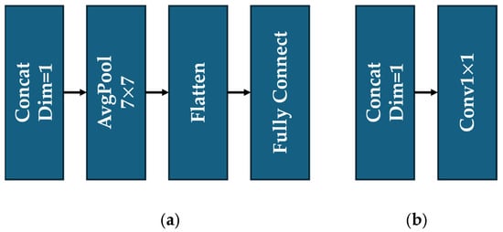 To effectively fuse features from the ResBlock and UBlock and obtain the corresponding outputs, we used two different Feature Merge modules for image classification and segmentation, respectively. For classification, the output feature maps from the ResBlock and UBlock were first concatenated along the channel dimension, through an average pooling layer, and then flattened into a fully connected layer to generate the classification results. For segmentation, the feature maps were first concatenated along the channel dimension; next, we performed weighted pixel summation across channels for channel-wise feature integration via a point convolution layer, then obtained the segmentation outputs. Structures of these two modules are depicted in Figure 8a,b, respectively.