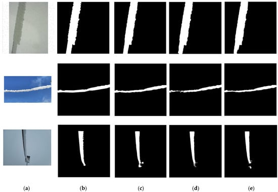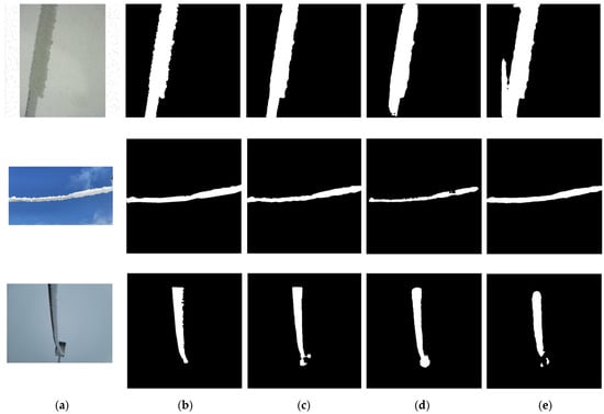 We categorized the images into three groups based on the weather conditions and background characteristics: (a) images captured under good weather conditions (e.g., sunny days); (b) images captured under harsh weather conditions; (c) images containing other equipment in the background. Examples of these categories with their annotated masks are shown in Figure A1. In the training set, there were 115 samples from class (a), 1252 from class (b), and 100 from class (c). In the testing set, there were 11 samples from class (a), 99 from class (b), and 14 from class (c). The training set consisted of a total of 1467 samples, while the test set contained a total of 124 samples.