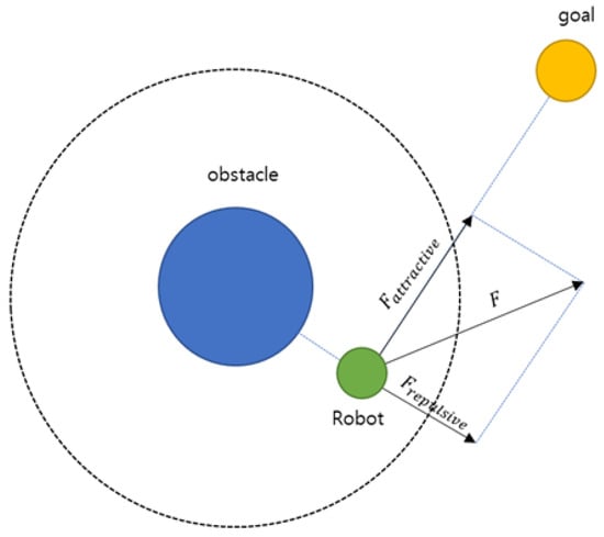 The theory of Potential Fields originates from Khatib’s Artificial Potential Field (APF) model [9]. As illustrated in Figure 1, APF combines attractive forces that guide a vehicle toward its destination and repulsive forces that prevent collisions with obstacles. By synthesizing these two forces, the model simplifies environmental interactions on a two-dimensional plane, enabling path generation even in complex surroundings.