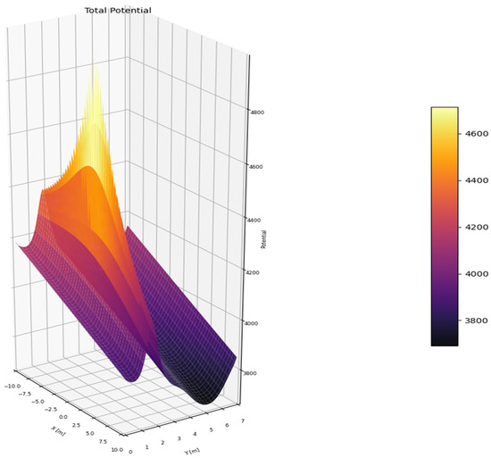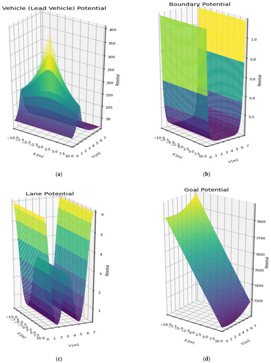 where denotes the coordinate of the road boundary, and is a scaling factor that determines the magnitude of the repulsive potential. As the distance to the boundary decreases, the potential rises sharply, thereby generating a strong repulsive force that prevents the vehicle from approaching unsafe edge regions.