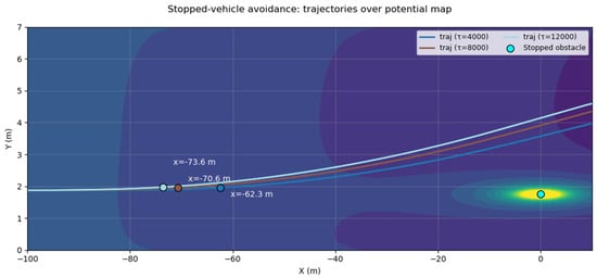 Through stationary-vehicle avoidance experiments, variations in trajectories were analyzed for different values, and an effective value was selected based on observed performance. Specifically, for = 8000, the onset of avoidance occurred at a Time To Collision(TTC) ≈ 4.2 s, which is consistent with commonly accepted safety thresholds (typically 3–5 s), as illustrated in Figure 4, which shows the trajectory variation and lane-change initiation distance under different τ values during stationary obstacle avoidance. Consequently, this value was adopted in this study.