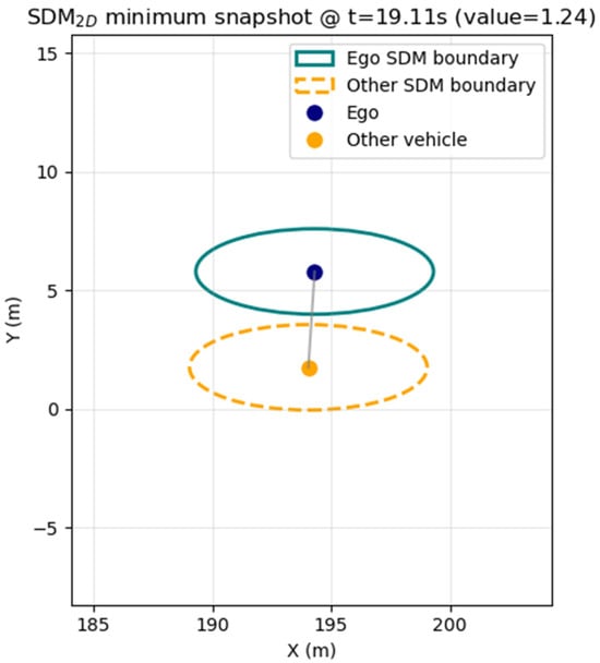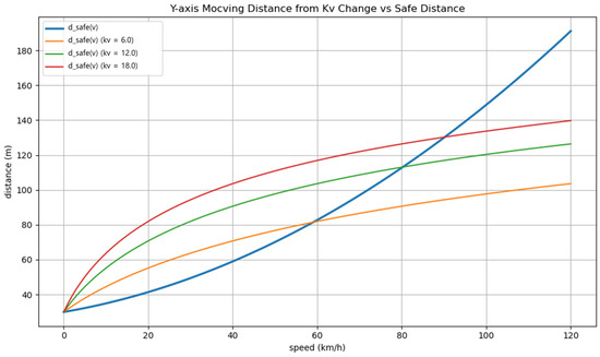 As illustrated in Figure 5, = 6 provides adequate safety in the low-speed region but fails to deliver sufficient responsiveness at higher speeds due to its low growth rate relative to the safety-distance model. Conversely, = 18 ensures robust responsiveness even at high speeds, but its excessive growth at low speeds induces unnecessarily conservative behavior. In contrast, = 12 offers a balanced trade-off, closely aligning with the safety-distance curve across a typical driving speed range (0–80 km/h), intersecting near 80 km/h. This alignment secures adequate safety margins in low- and medium-speed conditions while maintaining acceptable responsiveness in high-speed scenarios. Based on these observations, = 12 was adopted as it harmonizes the potential function’s sensitivity with safety-distance standards while mitigating both overly defensive maneuvers and underreaction during real-world driving.