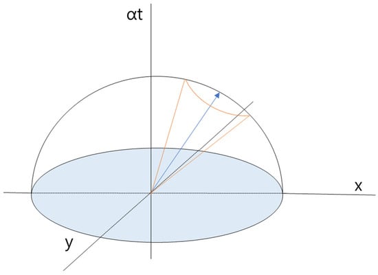 When the slope in the spatiotemporal domain is 1 (i.e., 45°), the vehicle maintains its target velocity. At the start of path generation, the reachable domain forms a spherical shape centered at the initial point. By excluding backward time progression, this region becomes hemispherical. Further restricting the movement to a conical region using angular constraints enables control over speed and steering angle, as illustrated in Figure 6, which visualizes the hemispherical and conical search regions in the spatiotemporal domain.