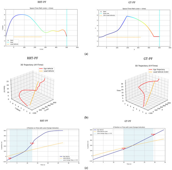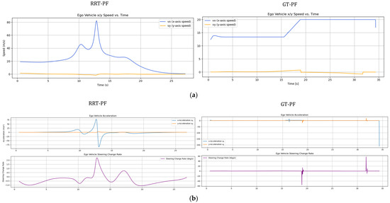 However, in specific situations such as proximity to obstacles, unexpected hazards, or the need for global optimization and rapid arrival, the RRT method exhibited superior performance. Therefore, in RSU-based infrastructure systems where real-time performance and computational efficiency are prioritized, the GT-PF method is realistically favorable. For scenarios requiring rapid arrival or handling of exceptional complexity, a hybrid approach using RRT selectively may be beneficial.