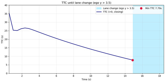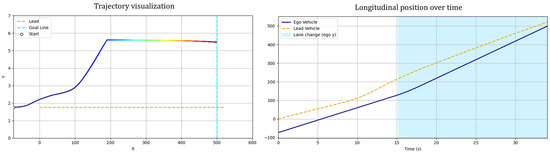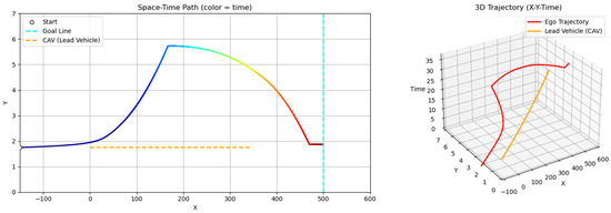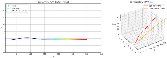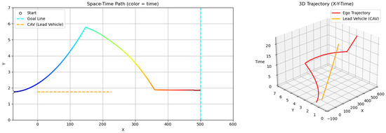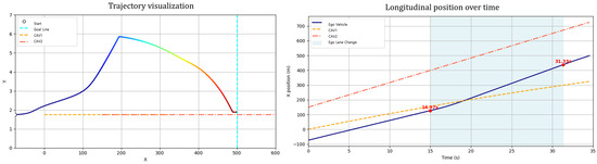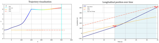 Simulation results showed that the ego vehicle avoided unnecessary lane changes, maintained a stable inter-vehicle distance, and continued traveling in the original lane. This outcome demonstrates that the proposed path planning algorithm does not mechanically attempt merging but rather makes context-aware decisions that prioritize safety. This scenario serves as an evaluation of the method’s ability to flexibly reconfigure plans and avoid risky maneuvers in complex traffic conditions.
