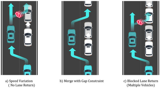 The proposed approach was initially designed and implemented based on a single primary scenario; however, the additional experiments described above validate its stability and adaptability under diverse traffic conditions. The computation times for Sub-Scenarios A, B, and C were approximately 0.37 s, 0.38 s, and 0.41 s, respectively, demonstrating minimal variation across different traffic complexities. These findings confirm that the algorithm can effectively adjust the trajectory in response to dynamic factors, such as variations in the speed of leading vehicles, multi-vehicle interactions, and the feasibility of merging opportunities. Specifically, the method exhibits the capacity to flexibly recalibrate path shapes and optimize lane-change timing and lane-return decisions according to situational demands. Nevertheless, this study is limited to straight road segments, and further work is required to address complex environments involving intersections, curves, and variable lane configurations.