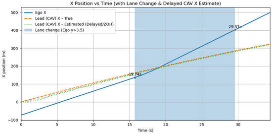 x-t plot of actual and delayed leading vehicle trajectories with ego response under latency.