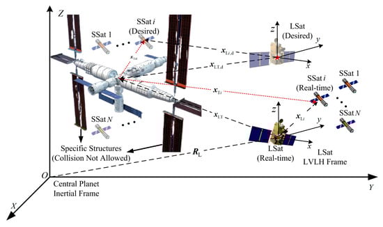 A close-range surrounding task against an unknown non-cooperative TSat with a specific structure by SSats driven by a leader satellite (LSat) is considered, as shown in Figure 1. The dynamic properties (including mass and orbital parameters) and maneuver commands of the TSat are all infeasible to both the LSat and all SSats, and these are the unknown elements considered for the non-cooperative TSat in this paper. The relative vectors (including the relative position and velocity) and shape parameters (including TSat size and the appearance parameters of the specific structures) of the TSat can be measured by the LSat accurately. Thus, to achieve a close-range surrounding of the TSat, all SSats are desired to form and track an expected close-range configuration, which is distributed in the gap of the TSat real structure, namely, hold for all with being a positive bound constant as shown in Figure 1. Each represents the relative vector from the TSat to SSat , and represents the desired one. Furthermore, collision avoidance for all SSats and all specific structures of the huge target is asked.