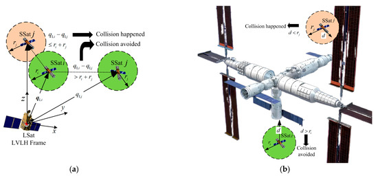 To describe the threat from other SSats shown in Figure 2a, a circumscribed sphere with safe radius can be directly used for each SSat. Thus, the collision threat imposed by SSat , , to SSat can be written as follows.