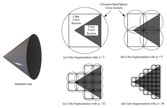 As shown in Figure 3, the sample cone can be always contained by cubes with , . Considering being the circumscribed sphere of the th cube with radius and being the circumscribed-sphere volume of the th cube, the larger the side length of the th cube, the larger the total enveloping volume of the circumscribed spheres . As a result, by selecting different cube sizes for each specific structure of the TSat, the accuracy of the envelope modeling can be flexibly adjusted.