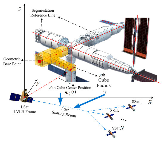 The attitude of the TSat can be ignored. The TSat’s shape parameters of specific structures can be accurately measured by the LSat, and the cube segmentation of the huge target structures can be achieved via the ACSB method by the LSat, and the parameters of all the circumscribed spheres can be shared to each SSats with no time delay.