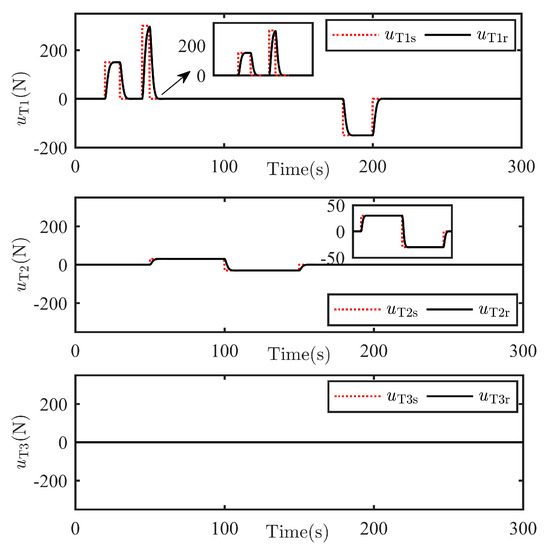 The TT controller command in each channel is shown in Figure 8, respectively. It illustrates that the controller designed in Equations (16) and (17) can firstly track the escaping behavior of the TSat successfully. On the other hand, the proposed controller will not ask high requirements for the actuators of the LSat (such as extremely high amplitude or sudden step), which also guarantees feasibilities for all SSats with a weaker maneuverability than the LSat.