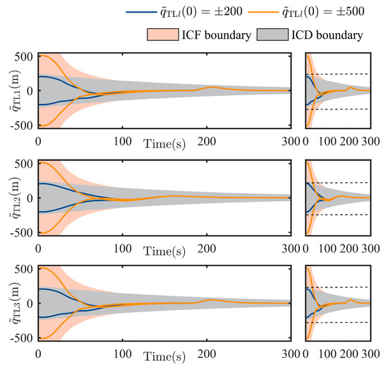 For the TT part, by using the virtual controller and TT controller in Equations (16) and (17) respectively, the LSat tracking behavior against the TSat (including the dynamic response of the TT position error , the transformed error and the target pursuit controller () are firstly shown. Note the initial conditions are commonly asked by the boundaries which can guarantee both user-defined transient and steady-state performance. To further illustrate the advantages of removing these conditions, two categories of boundaries, namely the initial-condition-free (ICF) boundaries and the initial-condition-dependent (ICD) boundaries, are compared under different initialization status. The initial TT states considered are shown in Table 3, and corresponding comparison results are shown in Figure 6, Figure 7 and Figure 8.